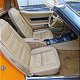 Now standard is the custom level interior trim., featuring choice of leather (back cover) or cloth-and-leather seating surfaces (below) on full foam, deep-contoured bucket seats. Select from black, buckskin, red, smoke gray, blue or brown. Or choose from leather-seat interiors in white with buckskin, red, smoke gray or blue accents.