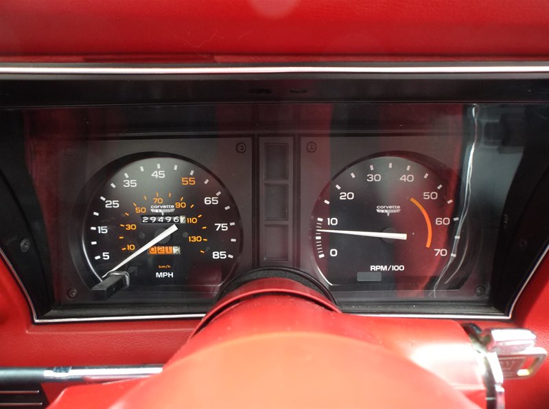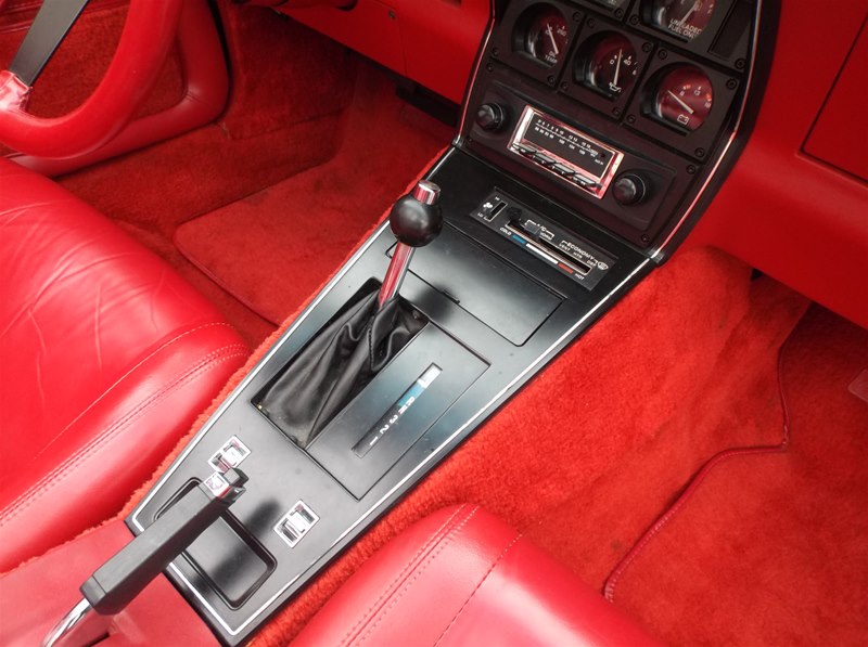 The interior on this Corvette is very nice and fresh. Non-smoker vehicle and all gages still look very fresh and crisp. No fading on upholstery, carpet, dash or door panels. There is a small tear in the driver’s side seat which is common and we plan on getting that corrected right away. The steering wheel looks nice with no wear, even the original floor mats and center plastic console is still in excellent condition for the age. No tears in the floor mats or carpeting and no stains as well. Seat belts are all original with the labels still intact and no dirty stains from hands,as this red is a lighter color and will tend to show dirt and wear easier. The rear battery tray is not broken, all lighting is working, and even the door buzzer still sounds when the door is open. Just another nice example of an original 1981 Corvette in a rare color combintation with low mileage.