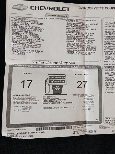 Offered For Sale is this very clean and well maintained 2006 Corvette Coupe. Finished in optional Velocity Yellow premium paint with Ebony leather interior. This Corvette has only 31,571 actual miles and was a one-owner car up until April of 2024 when it was purchased locally in Ozark Missouri. The car has been garaged and looks “as new” in almost all areas of the paint, trim, glass, and interior. The car has no rock chips on the front bumper and the rocker panels are as clean as you will see. The headlight lenses are also extremely nice as many need replacing over time. Just another example of the car if you compare it to others on the market as this Corvette was properly cared for. There has been PPF “Paint Protection Film” wrapped on the front bumper and rocker panels to prevent those rock nicks and chips. All of the window glass has been tinted and the cross over bar from the removable glass roof panel and the rear hatchback window glass has been wrapped in a gloss black finish to give the roof line a smoother look. This can easily be removed without any harm to the paint if desired. The engine and drivetrain is all stock and original just like it came from the factory.