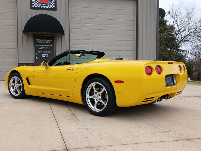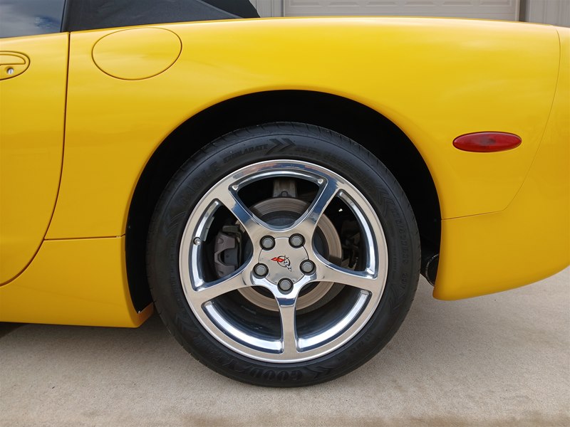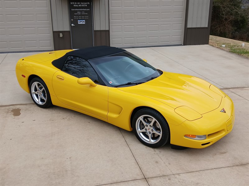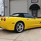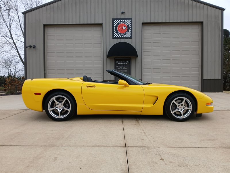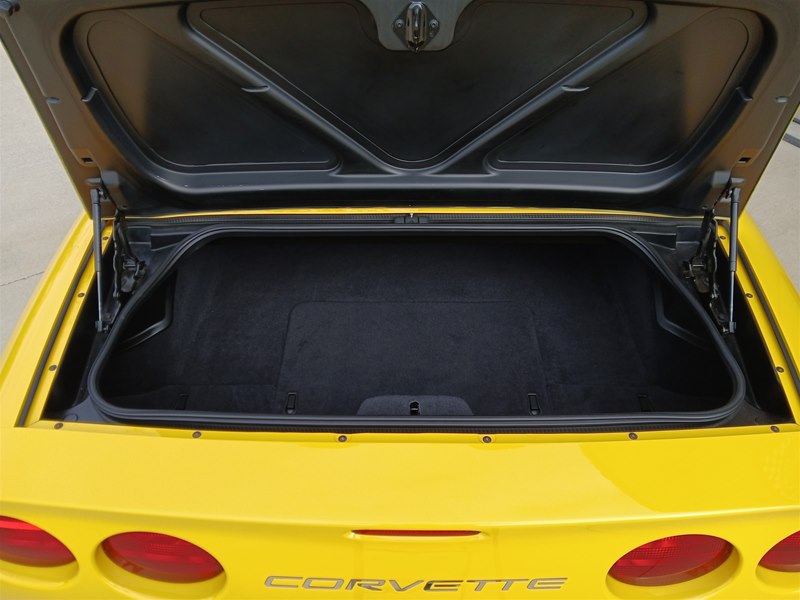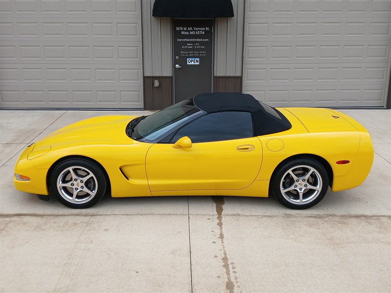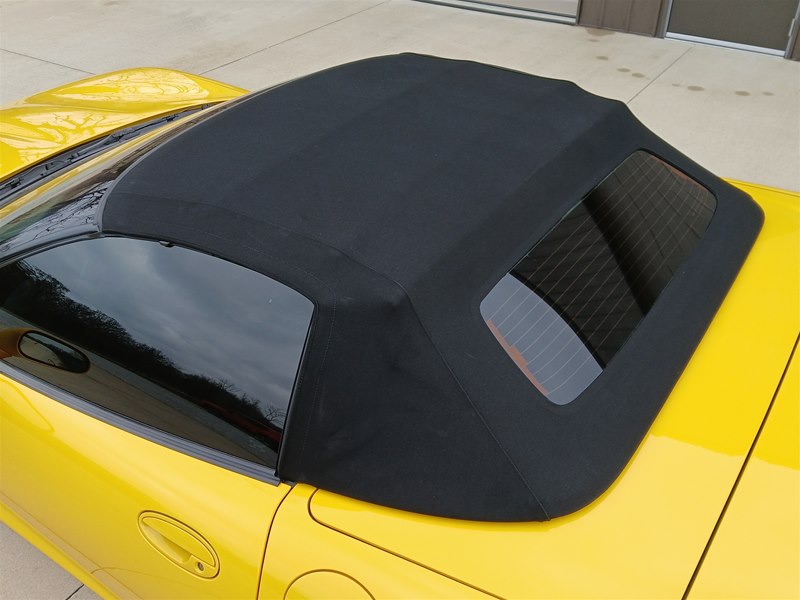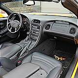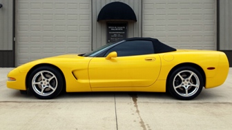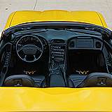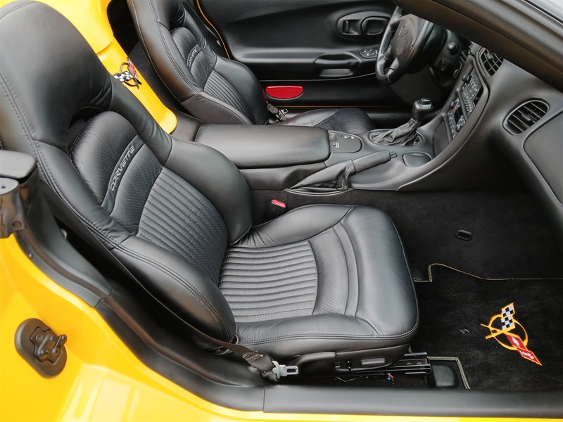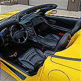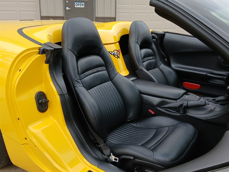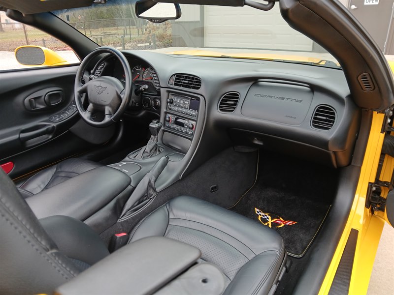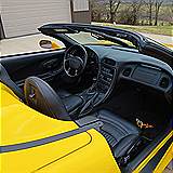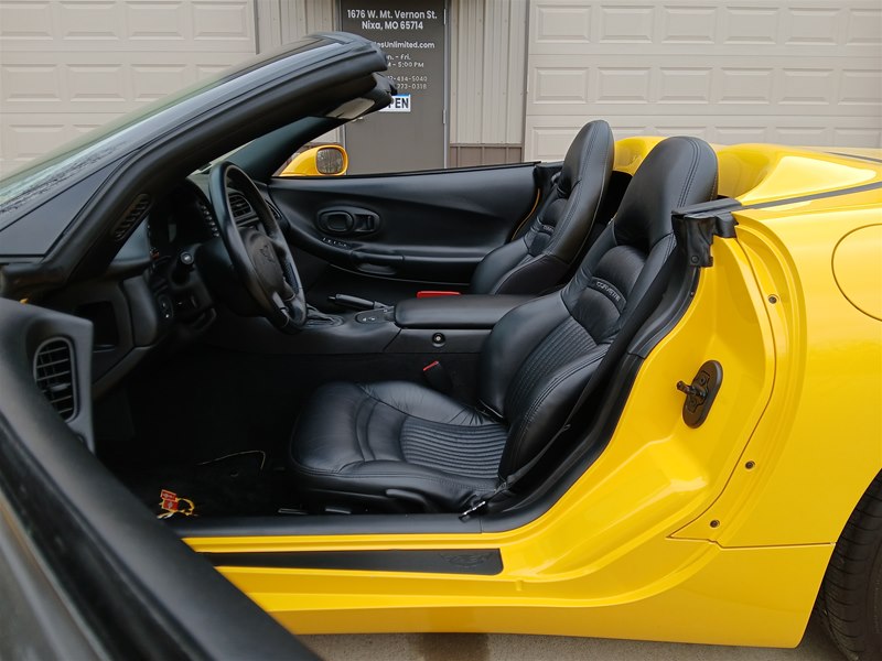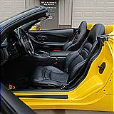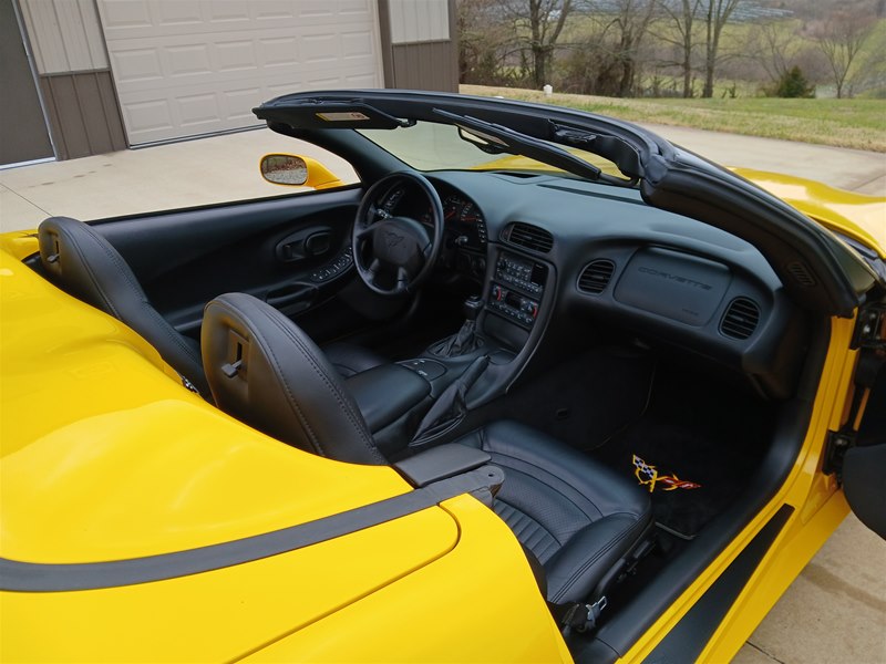 The exterior paint finish is very nice with no signs of any paint work or repairs done. The body lines are super nice and there aren’t any rough scuff markings under the front end as commonly seen. All of the window glass is very nice and the side and back window glass has been tinted. There are no modifications to this car and it is all stock down to the exhaust system which I like to see. The only added accessories are the chrome emblems in the front license plate cover and the rear bumper that can be removed and a nice set of Lloyd C5 logo floor mats with yellow piping around the edges. The original carpeted floor mats are in the trunk and show no wear. This vehicle has been garaged and stored inside out of the elements. The interior looks new with little to no wear at all and the passenger seat doesn’t even look as though it has been sat in many times. All of the leather finish on the dash pad, seats, door panels, steering wheel, all have that “Like New” appearance with no harsh glossy chemicals applied to them. The Millennium Yellow was an optional color and is just simply stunning when seen out on the road. This color was first introduced back in 2000 and was phased out in the early 2005 C6 models. The black leather interior and matching cloth top goes well with this color with no break up that you see with the light oak and gray interior choices that were available.