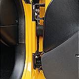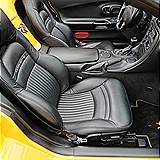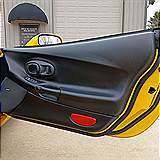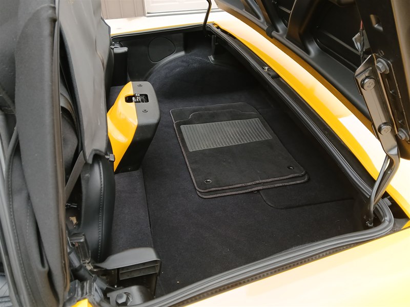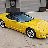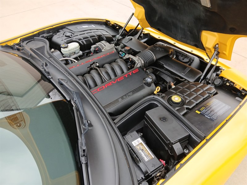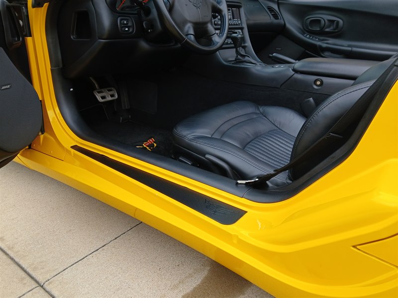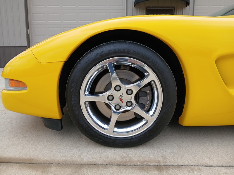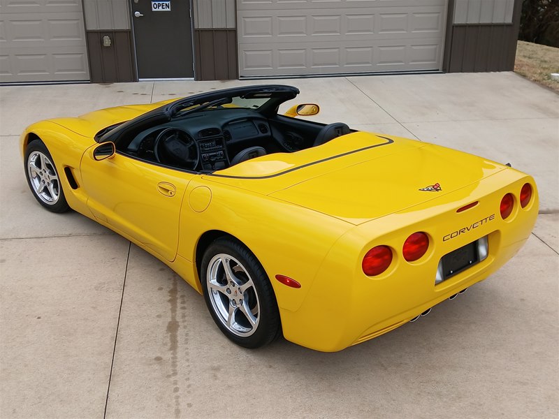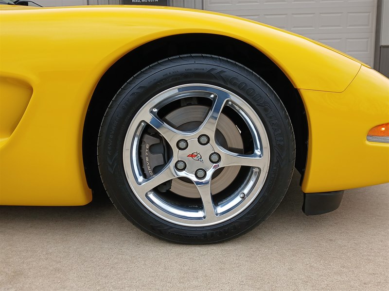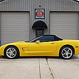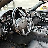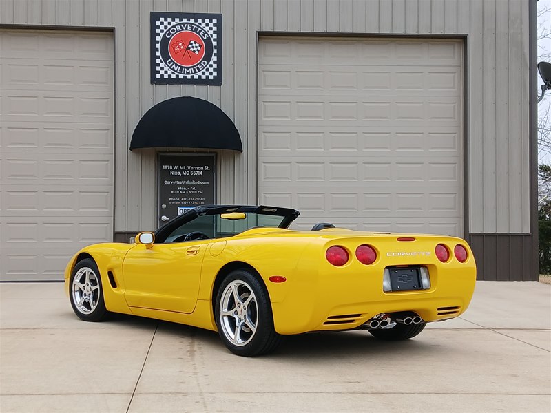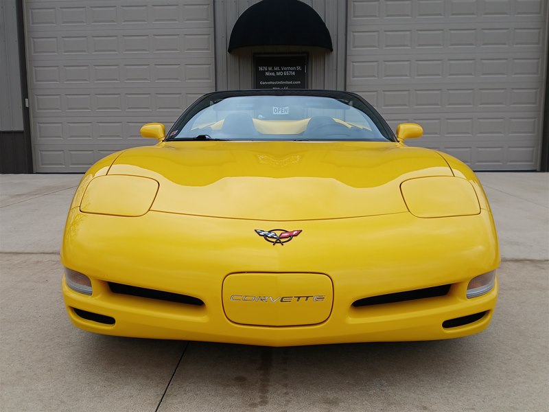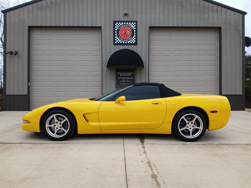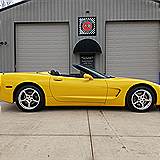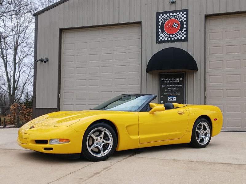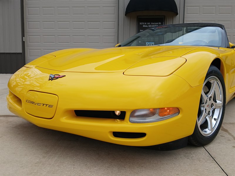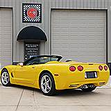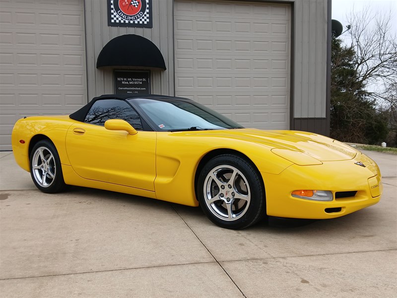 The exterior paint finish is very nice with no signs of any paint work or repairs done. The body lines are super nice and there aren’t any rough scuff markings under the front end as commonly seen. All of the window glass is very nice and the side and back window glass has been tinted. There are no modifications to this car and it is all stock down to the exhaust system which I like to see. The only added accessories are the chrome emblems in the front license plate cover and the rear bumper that can be removed and a nice set of Lloyd C5 logo floor mats with yellow piping around the edges. The original carpeted floor mats are in the trunk and show no wear. This vehicle has been garaged and stored inside out of the elements. The interior looks new with little to no wear at all and the passenger seat doesn’t even look as though it has been sat in many times. All of the leather finish on the dash pad, seats, door panels, steering wheel, all have that “Like New” appearance with no harsh glossy chemicals applied to them. The Millennium Yellow was an optional color and is just simply stunning when seen out on the road. This color was first introduced back in 2000 and was phased out in the early 2005 C6 models. The black leather interior and matching cloth top goes well with this color with no break up that you see with the light oak and gray interior choices that were available.