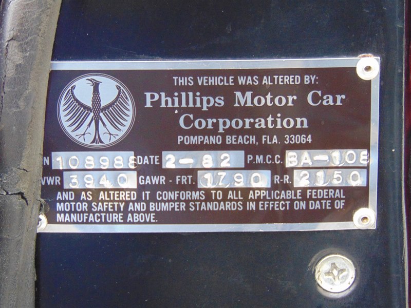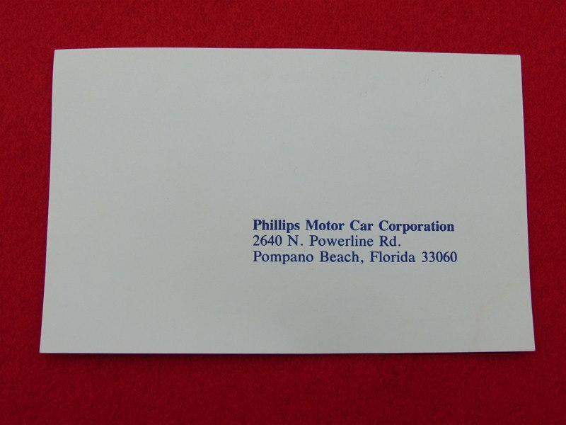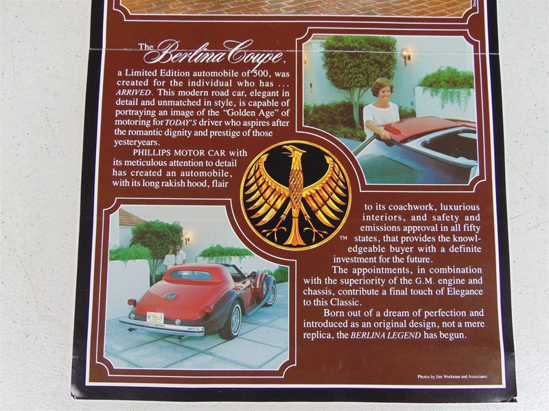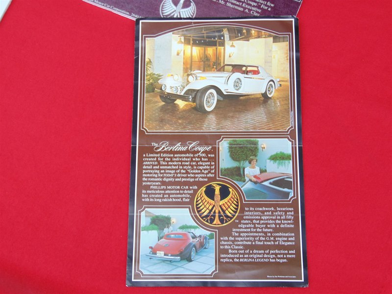 PHILLIPS MOTOR CAR with its meticulous attention to detail has created an automobile, with its long rakish hood, flair to its coachwork, luxurious interiors, and safety and emissions approval in all fifty states (Back then in 1982), that provides the knowledgeable buyer with a definite investment for the future.