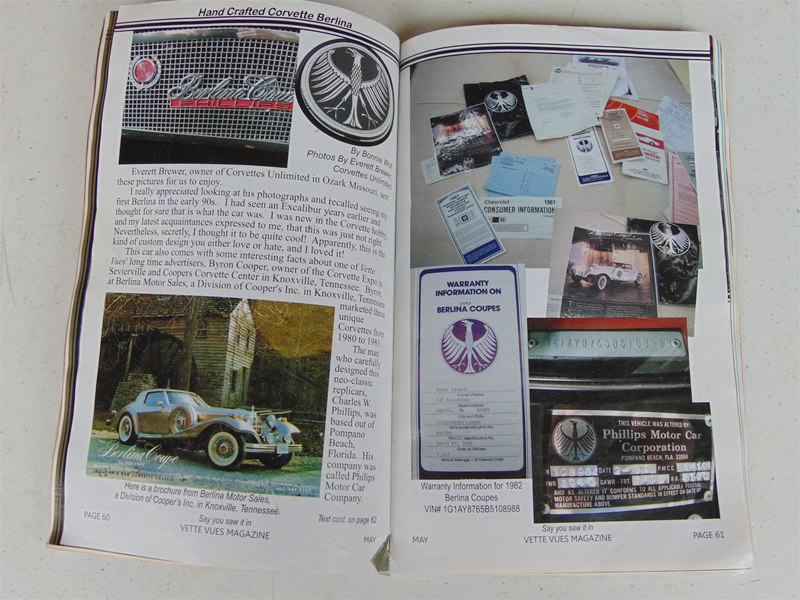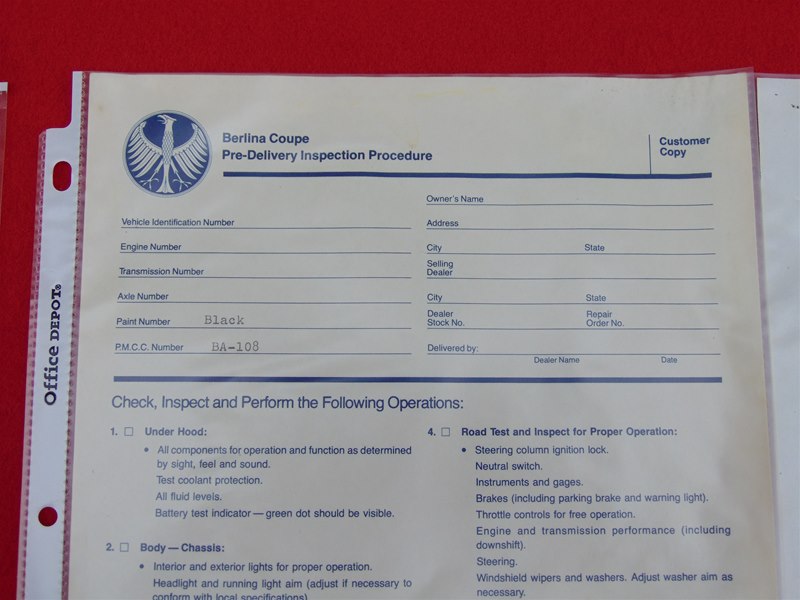 We do have an extensive amount of paperwork and documentation that all comes in two separate three ring binders. One binder has all of the original documents and the other three ring binder has all of the receipts that we have spent on the car from the past 6 years. Documentation includes several brochures from Phillips Motor Car Company, original dealer warranty book with the original owners name and information with the Berlina Logo on the actual warranty book, original pre-delivery inspection sheet with also the Berlina Logo, original small folder that your documents came in with the Berlina Logo, sales brochures, original owners manual and Delco radio manual, copies of original patent that Phillips Motor Car Company had to have and assembly manual of the break down of the panels and parts, several pages of the story behind the concept of the Berlina, original consumer information brochure, original tire brochure, original warranty registration from Phillips Berlina that has never been filled out, original 1981 GM general maintenance brochure, original sales brochure for the 1981 model Corvette, original build sheet, window sticker, invoice, both sets of keys, CarFax History Report, T-Top Storage Bags, original jack and lug wrench, huge bag that both t-tops can be stored in and is a carrying type of bag, two small signs for car show events displaying in detail about this Berlina and the concept behind it, inspection slip from previous owner, purchase information from previous owner, odometer statement on the miles from previous owner, previous title copy, and the list goes on. This car is very well documented and more paperwork than any Berlina you will ever see!