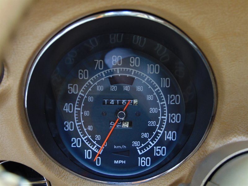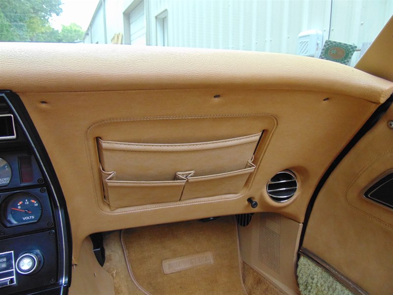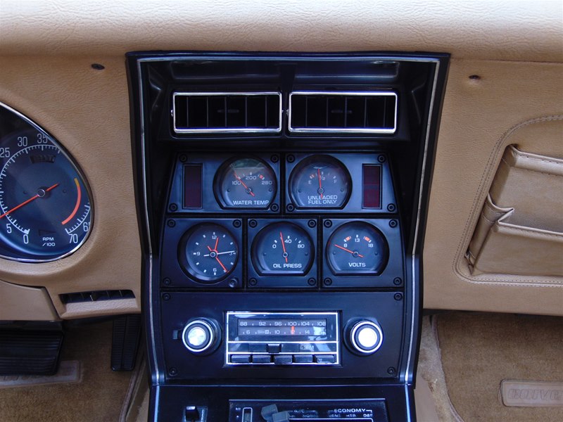 The interior is very presentable for being 42 years old. The leather seats show minimal wear and have no tears or rips. The door panels are nice and only have a couple flaws, but do not need replacing. Weatherstripping is still good but we did replace the t-top weatherstrips. The dash pad has no cracks or signs of repairs. The gauges and center cluster all look nice and fresh with crisp colored needles showing little to no fading. Seat belts are intact and the car retains its original carpeting which is amazing. The floor mats are replacements as this car was ordered without them. Yes believe it or not floor mats were an optional feature back in those days. It was a $22.00 option listed in the Black Book. All lights and gauges function with the exception of the clock, which is still a mechanical movement. Inside rearview mirror glass is excellent and not discolored as I have seen on the past on many of these models. No disappointments on the interior.