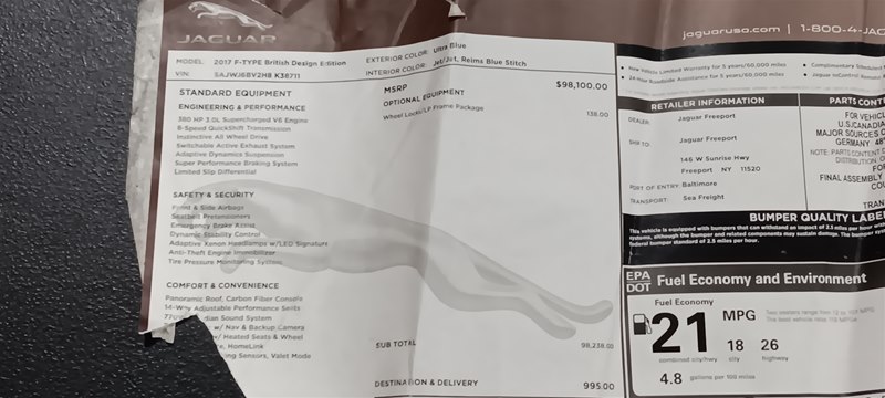 Version and is powered by a supercharged 380 HP V6. This Jaguar has been a local car for the past few years showing 51,610 actual miles on the odometer. Lady driven and well maintained. The overall condition is still very nice with minimal wear on the interior. A non-smoker vehicle as well. The exterior paint still shows nicely with a few stone nicks from highway driving. The wheels are all in excellent shape and the tires are a set of Michelin Pilot Sport 4S with plenty of tread life on them and date codes of 2020. The previous owner of this car purchased it in January of 2022 with an odometer reading of 41,633 showing at that time.Both sets of Key Fobs, the original window sticker and owners manual are all included with the vehicle. This Special Edition was only offered with just 300 units for the North American Market and that included all four colors that were offered making this Ultra Blue one Ultra Rare! The car is simply stunning and a real head turner stopping traffic wherever you go.