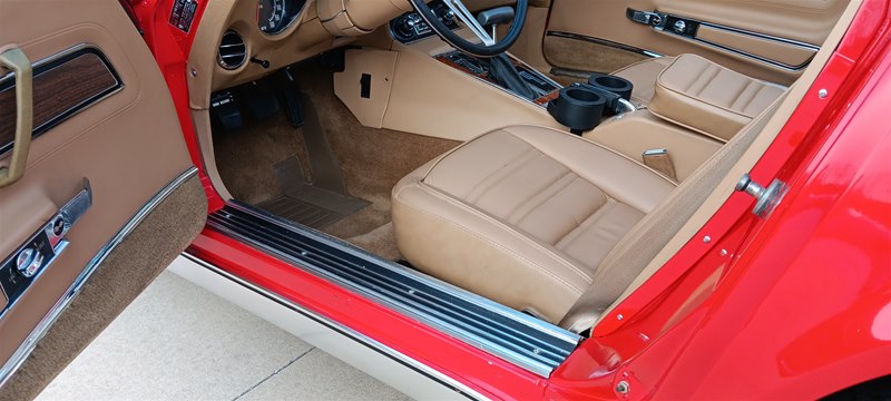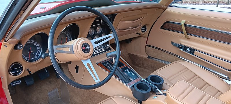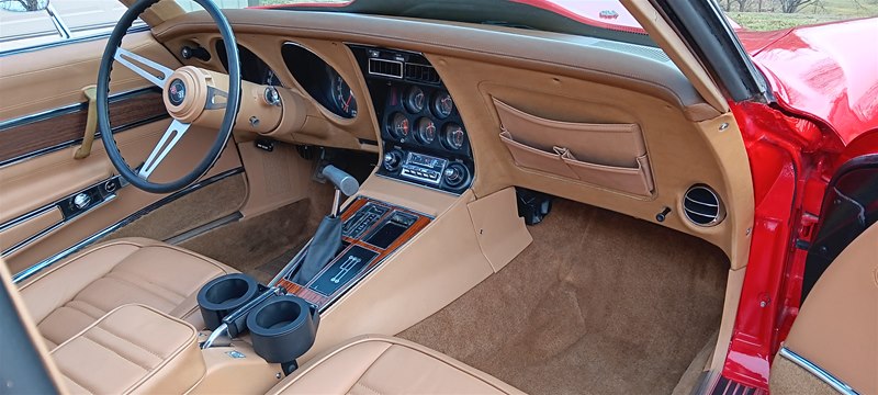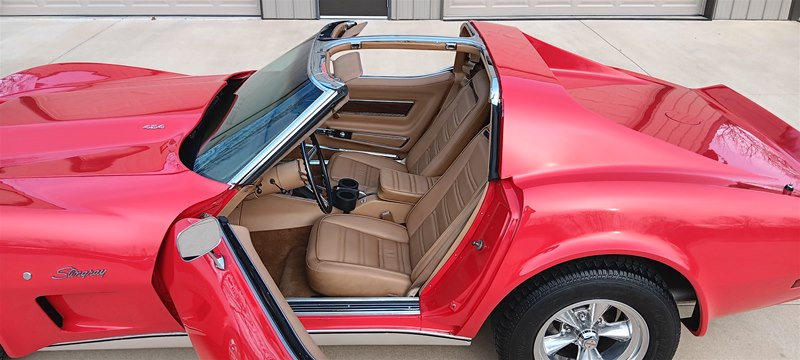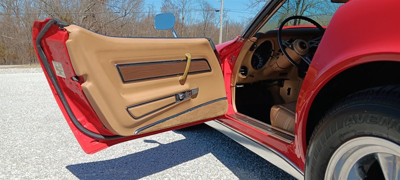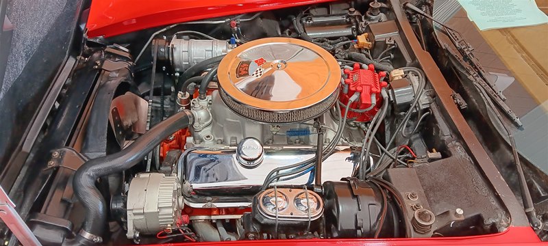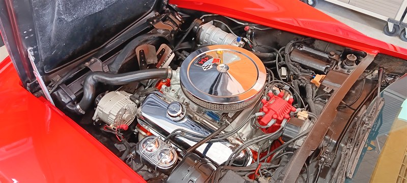This Corvette was born and original LS4 454 Big Block car according the the VIN #. The Fifth digit is a Z which designates the 454 C.I. V8 engine. The engine was completely rebuilt with receipts and paperwork to verify that. Not even a 1,000 miles has been put on the car since the rebuild of the engine and the paint job as well. The engine is the period correct dated coded one and was a numbers matching car, however, when the engine was rebuilt which is common to see, some of the numbers on the block were decked off in the process of the rebuild. The engine does have a performance cam, Edelbrock intake and carburetor along with a set of chrome plated valve covers and a set of ceramic coated headers.The ignition is a MSD and all of the components such as the starter, fuel pump, water pump, alternator, etc have either been replaced or rebuilt. The Muncie 4-Speed transmission was also rebuilt at the time and the car performs out well. The shifter has been swapped out with a Hurst one. The exhaust system is a true dual setup with a set of Dynomax mufflers giving the car a nice sound.