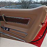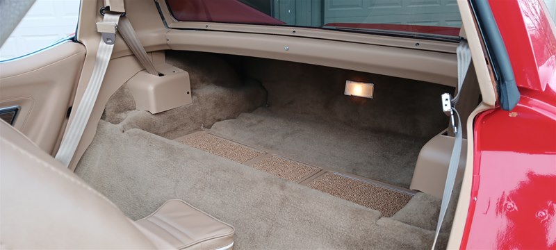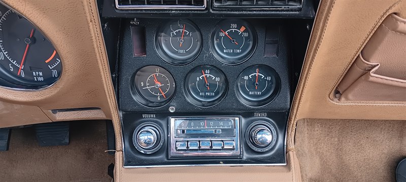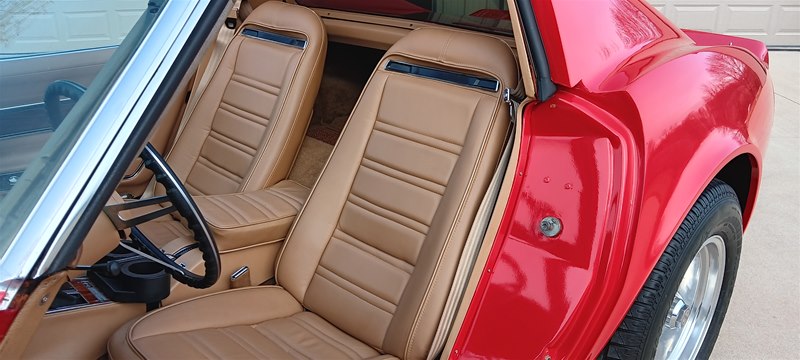 The interior on this Corvette for the most part has been redone. New leather seats and seat foam, new carpeting with a sound deadening material placed underneath to keep out the noise and heat during those hot summer nights, all new door panels with trim, new rear battery storage compartment, new center emergency brake console, all original instruments in very good condition with a retro custom audio sound stereo that fits in the same cavity as the original, and the original dash pad that is presentable but does have a crack at the speaker areas which was a common thing to see on the C3 models. The weatherstripping was all replaced and overall is a very nice looking interior in the saddle color that was correct for this car. The original steering wheel does look very good with minimal wear. This car does feature the nice tilt/telescopic steering wheel option.