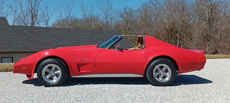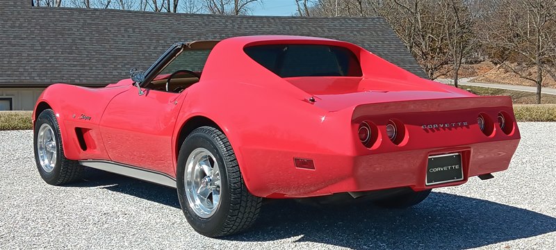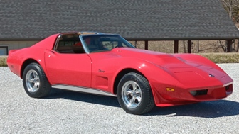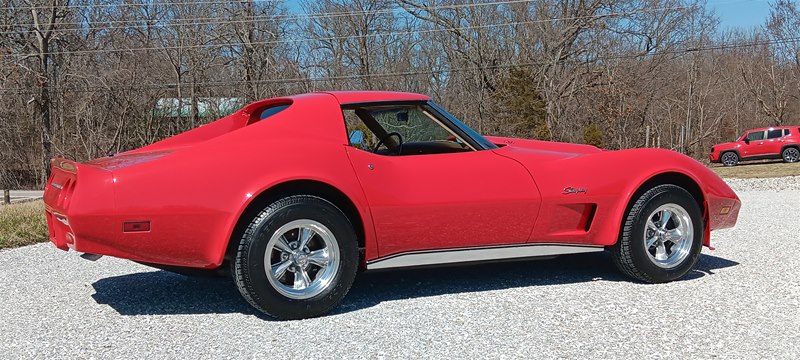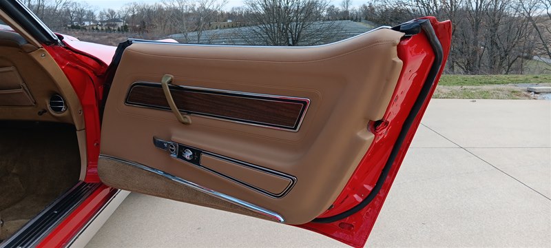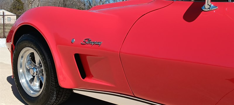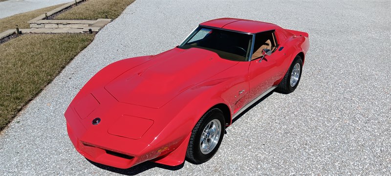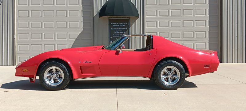 This 1974 Corvette Stingray T-Top Coupe is a factory born original 454 LS4 big block car with a 4-Speed manual transmission. This was the last year to see a big block engine ever offered in a Corvette and only 3,494 were built out of the total production number of 37,502. This Corvette underwent a very nice restoration in the past few years with a professional repaint done by Redline Finishes of Ozark Missouri at a cost of close to $10,000! That was done back in 2017 and the cost would even be higher today. The car is finished in a nice Corvette Red that is like the shade it would have been in 1974 but a much higher gloss finish with the clear coat that it was done in. The door jamb areas and all of the parts such as the hood, headlights, front and rear bumpers were all removed as that is a labor intensified job and most shops will not take the time to remove those items as the labor costs do get expensive. The body lines are all nice and the fit and finish is better than any. The front and rear bumpers were replaced with new fiberglass ones and resemble the 1980-1982 style. There was also a front spoiler added like what was seen on the 1978 Pace Car models and an option in 1979. The hood is also an L-88 style to accommodate the clearance of the new intake and carburetor setup on the big block engine. The window glass does appear to be all the original to this car and has been tinted which can easily be removed. The car does have a nice stance and drives as good as it looks with plenty of performance.