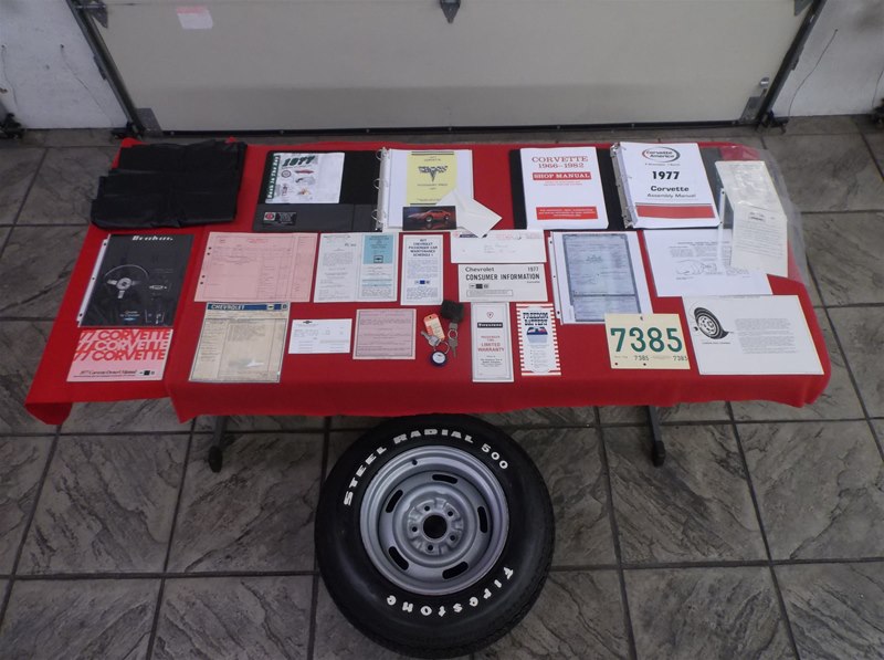 Documented with the original window sticker, purchase agreement, warranty book, original odometer statement, the original title to this car, original warranty stickers used by the service department when brought in for service, the original sales brochure, sunvisor tag, original post card from 1977, the original cruise control tag, original Chevrolet Consumer information brochure, an original letter from the dealership, original battery brochure, an original owners manual, shop manual, and an assembly manual, are all included with the sale of this car. The original T-Top storage bags are with the car along with two sets of keys, original jack and lug wrench, the original spare tire and wheel, and even the original spare tire lock. All of this documentation has been put into a three-ring binder that goes with this vehicle.