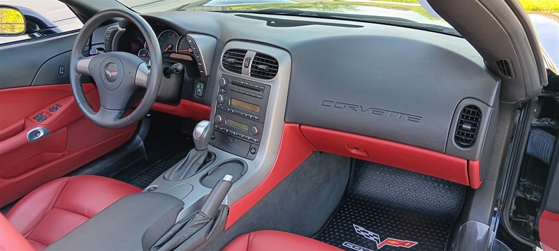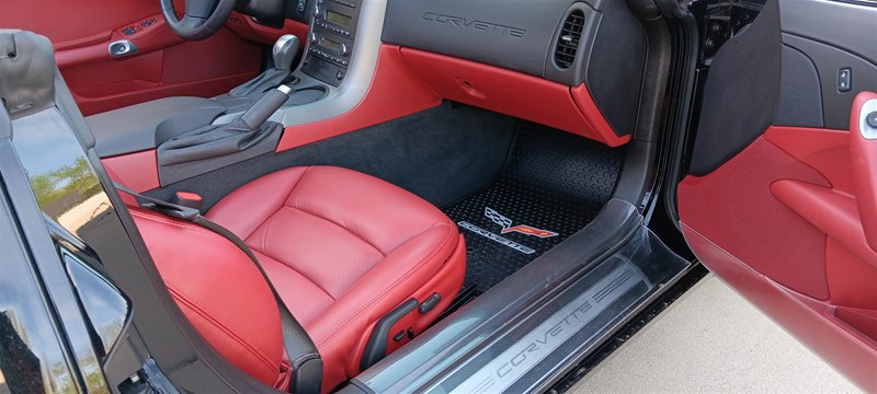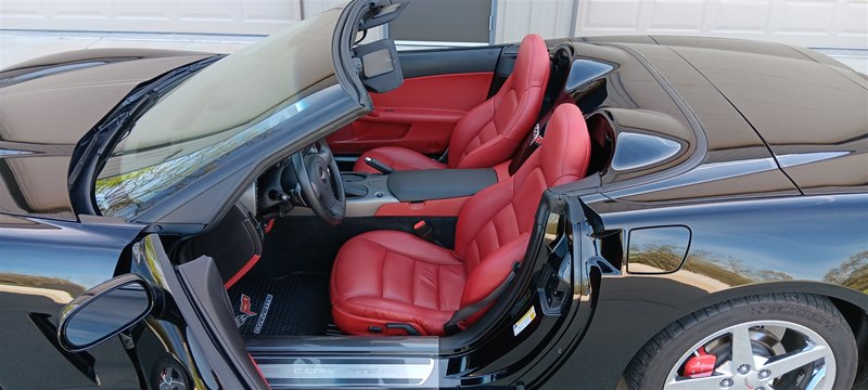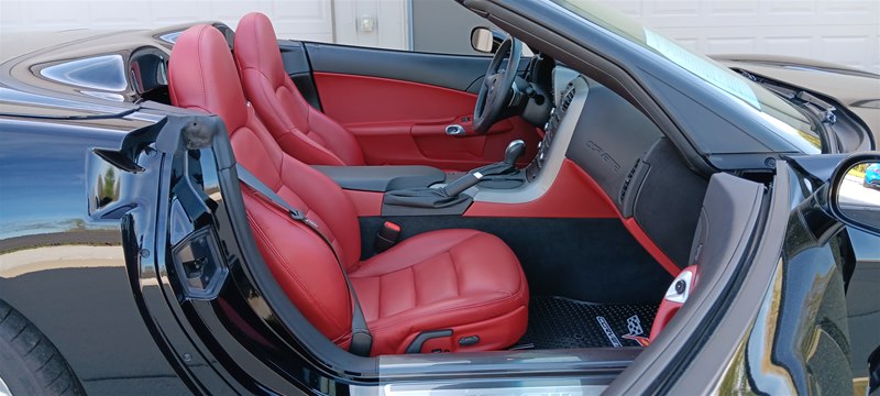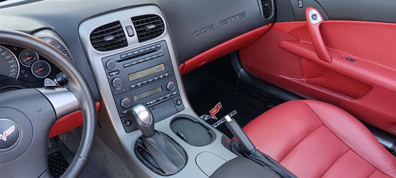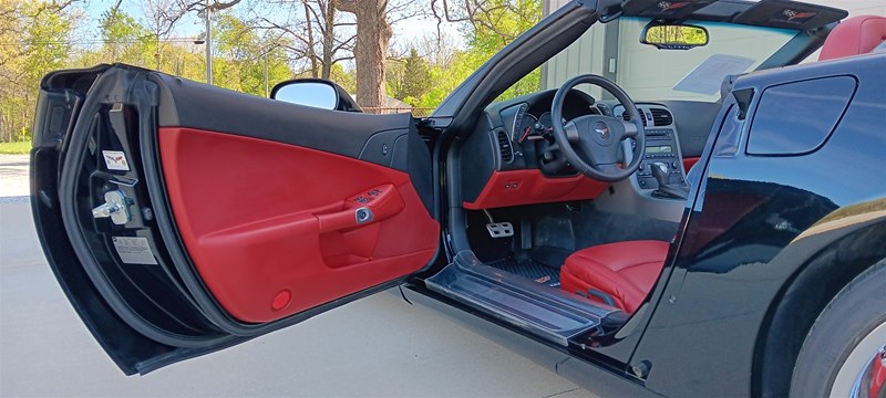 Corvette. We have owned this car in the past and know the history real well. The car is finished in Black exterior with Red Leather interior and a black cloth canvas soft top that is in excellent condition. This car has only 23,170 actual miles and is nicely documented with previous owner history as well as documents pertaining to this car. The overall condition of this Corvette is excellent and shows little to no wear on any of the components. The window glass has no chips or nicks and the paint is show quality and has recently been ceramic coated. The front nose of the car has PPF (Paint Protection Clear Film) to protect the paint from chips from driving the car. That can be removed without any harm to the paint. This Corvette is equipped with the 2LT package which includes many things such as the head-up display, dual power sport seats with lumbar support, heated seats, seat-mounted side impact air bags, Bose speakers, XM Satellite radio with a paid subscription, all power equipment, cruise control, memory package, heated outside mirrors, dual-zone air conditioning with outside temperature gauge, ABS, traction control, active handling, and more.The interior is like new with little to no wear as well and the car was a non-smoker vehicle. The leather wrapped tilt steering wheel looks perfect and the dash pad, door panels, and carpeting looks as nice as the day it left the factory. This Corvette is a very fun one to drive and is a show stopper with that red interior as it is seldom seen.