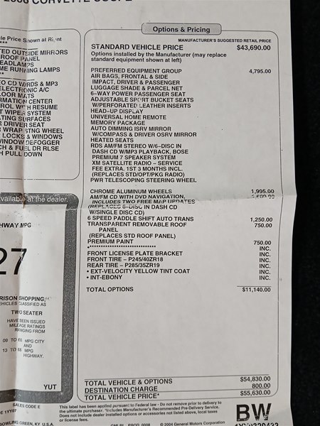 The Corvette was optioned with the 3LT package, chrome plated aluminum wheels, premium paint, 6-Speed Paddle Shift Automatic Transmission, Removable Glass Roof Panel, Factory Navigation Radio, and more.