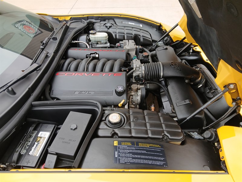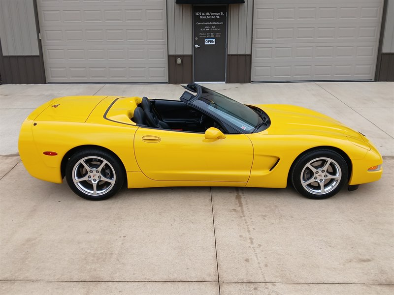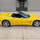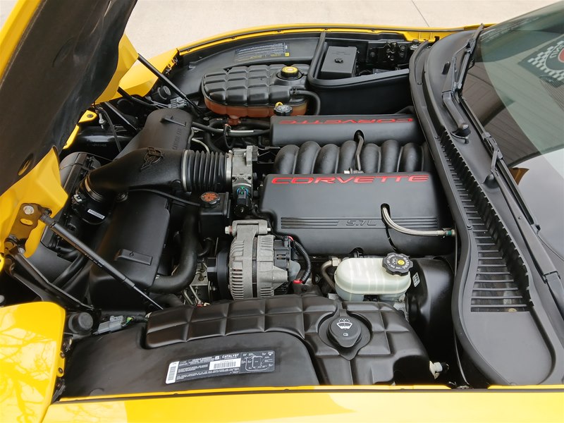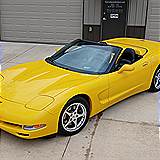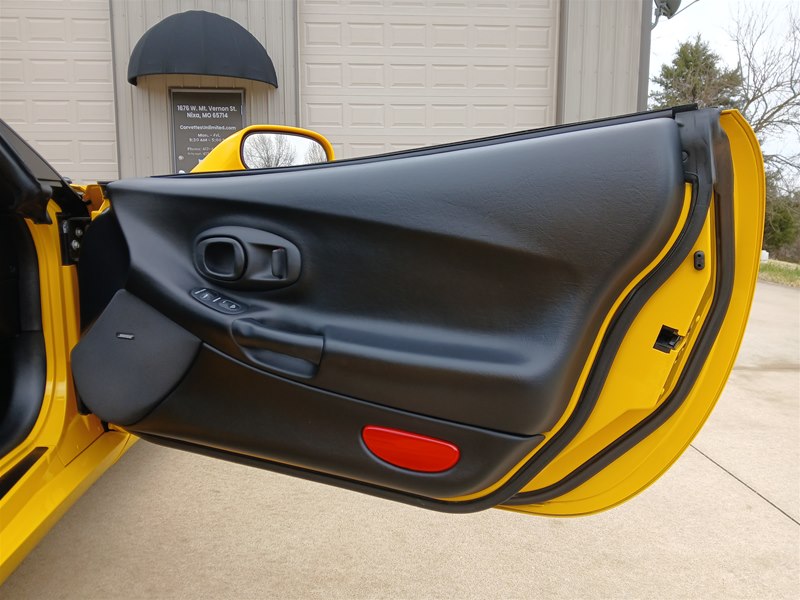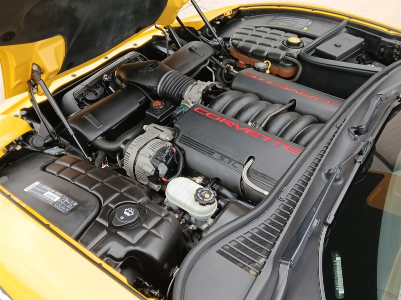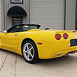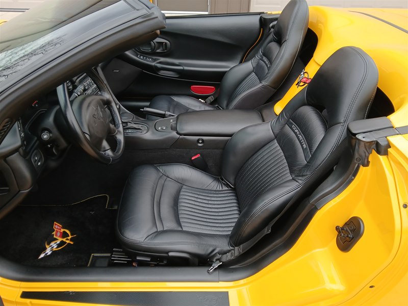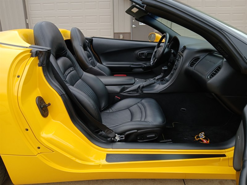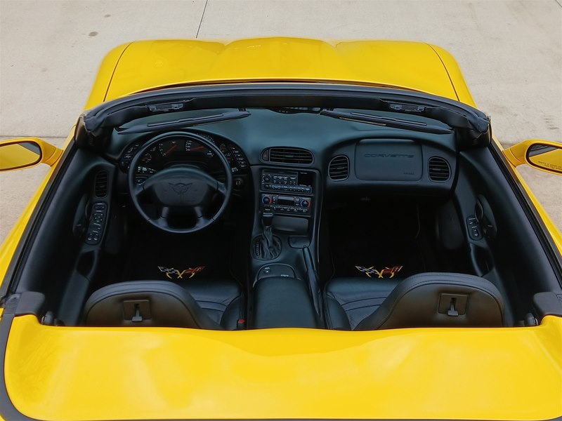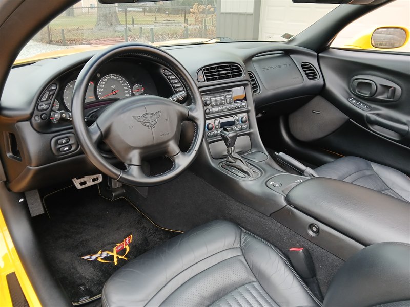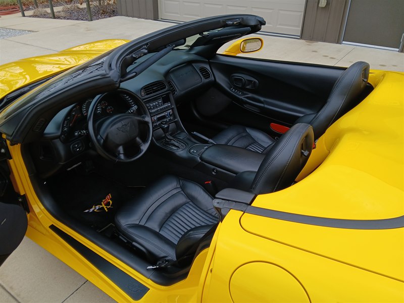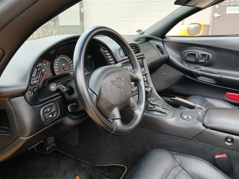 The exterior paint finish is very nice with no signs of any paint work or repairs done. The body lines are super nice and there aren’t any rough scuff markings under the front end as commonly seen. All of the window glass is very nice and the side and back window glass has been tinted. There are no modifications to this car and it is all stock down to the exhaust system which I like to see. The only added accessories are the chrome emblems in the front license plate cover and the rear bumper that can be removed and a nice set of Lloyd C5 logo floor mats with yellow piping around the edges. The original carpeted floor mats are in the trunk and show no wear. This vehicle has been garaged and stored inside out of the elements. The interior looks new with little to no wear at all and the passenger seat doesn’t even look as though it has been sat in many times. All of the leather finish on the dash pad, seats, door panels, steering wheel, all have that “Like New” appearance with no harsh glossy chemicals applied to them. The Millennium Yellow was an optional color and is just simply stunning when seen out on the road. This color was first introduced back in 2000 and was phased out in the early 2005 C6 models. The black leather interior and matching cloth top goes well with this color with no break up that you see with the light oak and gray interior choices that were available.