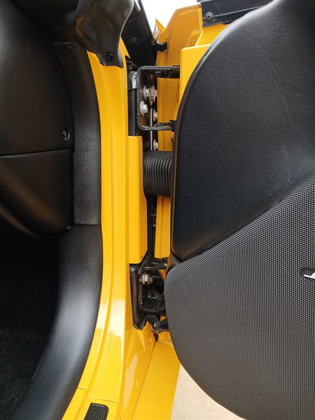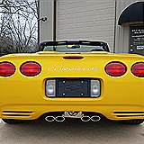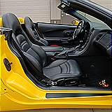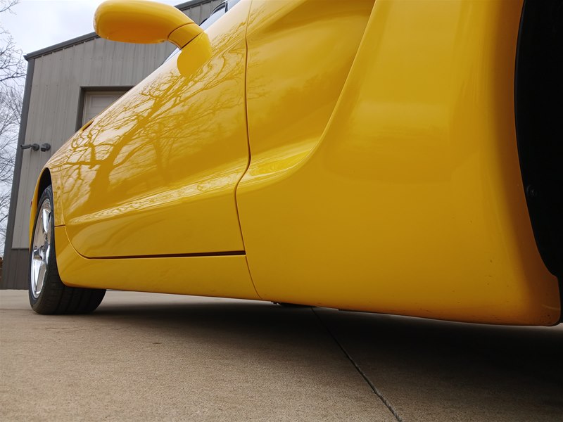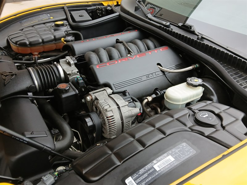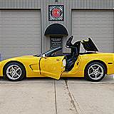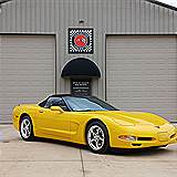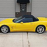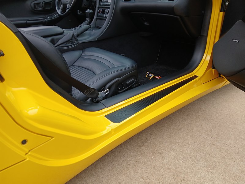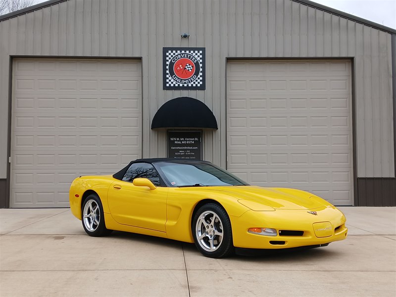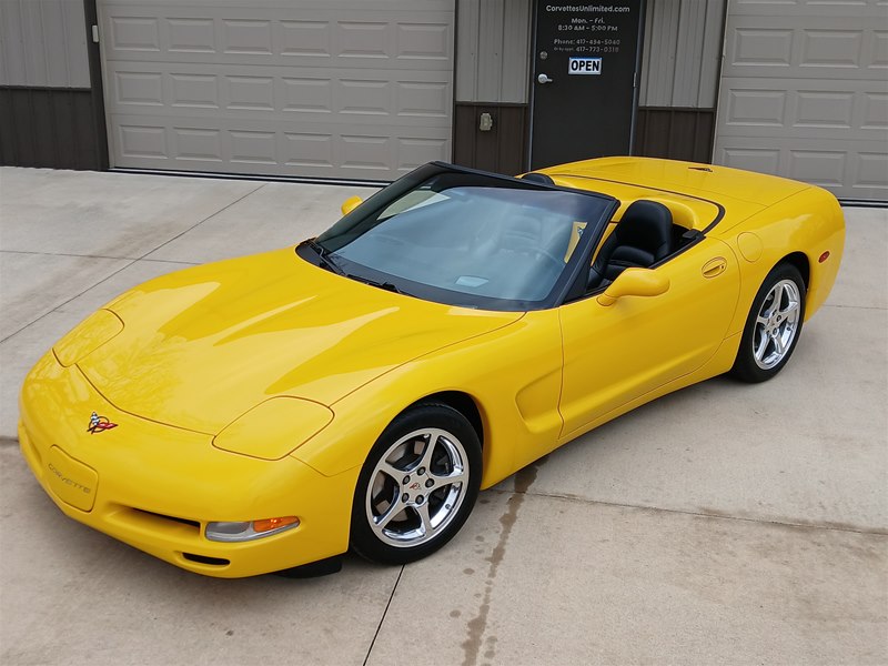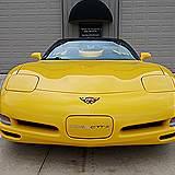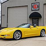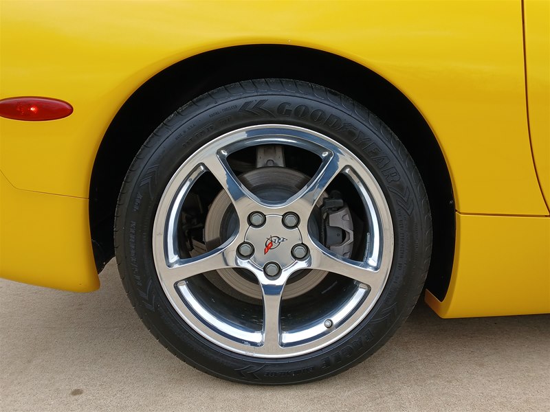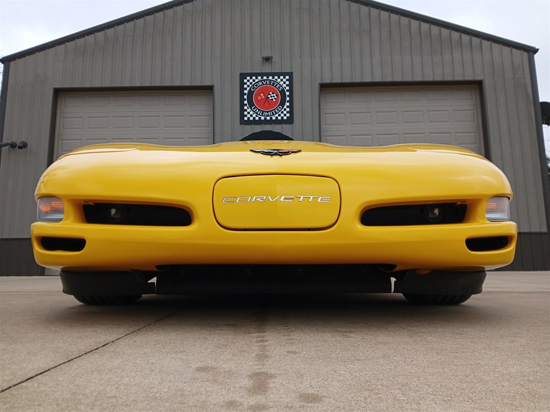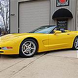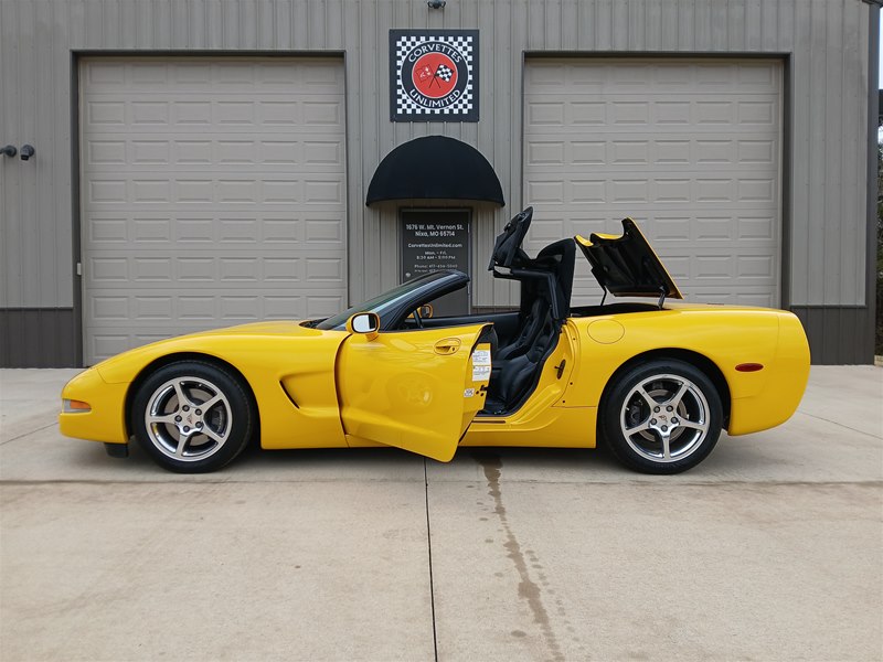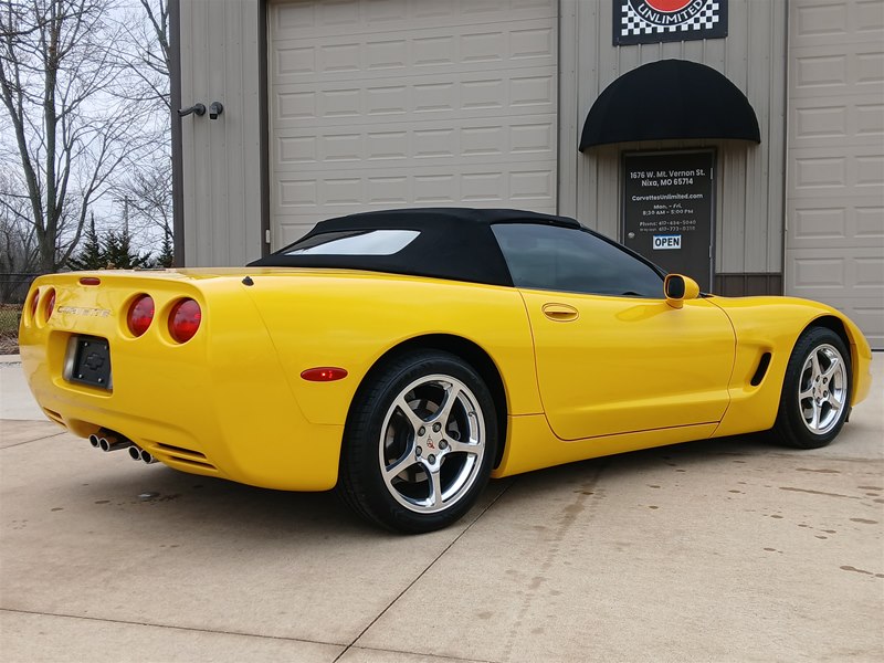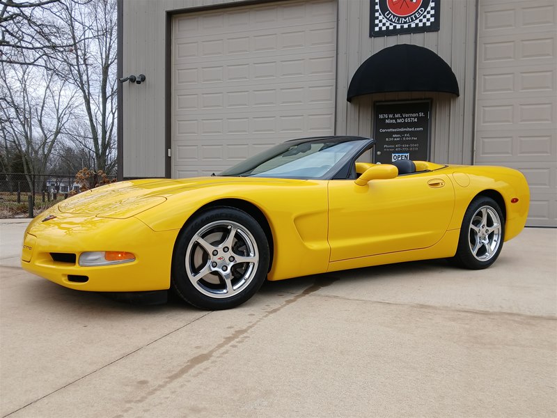 The exterior paint finish is very nice with no signs of any paint work or repairs done. The body lines are super nice and there aren’t any rough scuff markings under the front end as commonly seen. All of the window glass is very nice and the side and back window glass has been tinted. There are no modifications to this car and it is all stock down to the exhaust system which I like to see. The only added accessories are the chrome emblems in the front license plate cover and the rear bumper that can be removed and a nice set of Lloyd C5 logo floor mats with yellow piping around the edges. The original carpeted floor mats are in the trunk and show no wear. This vehicle has been garaged and stored inside out of the elements. The interior looks new with little to no wear at all and the passenger seat doesn’t even look as though it has been sat in many times. All of the leather finish on the dash pad, seats, door panels, steering wheel, all have that “Like New” appearance with no harsh glossy chemicals applied to them. The Millennium Yellow was an optional color and is just simply stunning when seen out on the road. This color was first introduced back in 2000 and was phased out in the early 2005 C6 models. The black leather interior and matching cloth top goes well with this color with no break up that you see with the light oak and gray interior choices that were available.