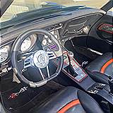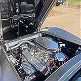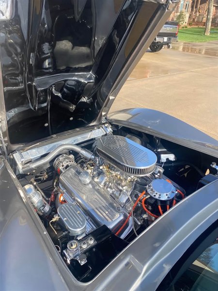 Some of the nice highlights include a GM Crate ZZ454 Big Block Engine with Aluminum Oval Port Heads, Tremec 5-Speed Manual Transmission, Vintage Air Conditioning, Custom C5 Generation leather seats, Hooker Side Mount exhaust system, new cloth convertible soft top, custom stereo, polished aluminum custom wheels with performance radial tires, custom stinger style hood, custom white faced instruments, custom leather wrapped steering wheel, tilt steering column, power windows, chrome roll bars behind the seats, engine compartment dressed with many chrome and polished aluminum parts, custom aluminum radiator, polished aluminum master cylinder, four-wheel disc brakes, custom dark charcoal exterior paint with black interior and orange accents.